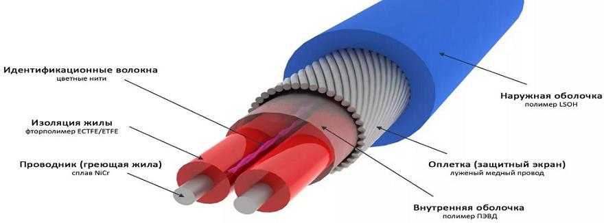 Двухжильный, резистивный кабель. По принципу работы идентичен одножильному, с той разницей, что холодный соединительный кабель подключается с одной стороны.