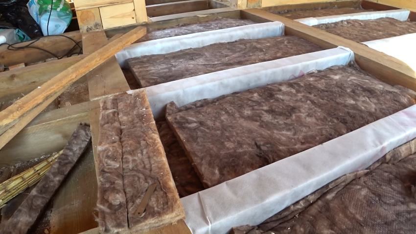 После того, как планки прибиты, между брусами размещается утеплительный материал, который нарезается непосредственно под размер углубления. Закрепляется утеплитель с помощью чернового настила, прикрепляемого к черепным планкам.